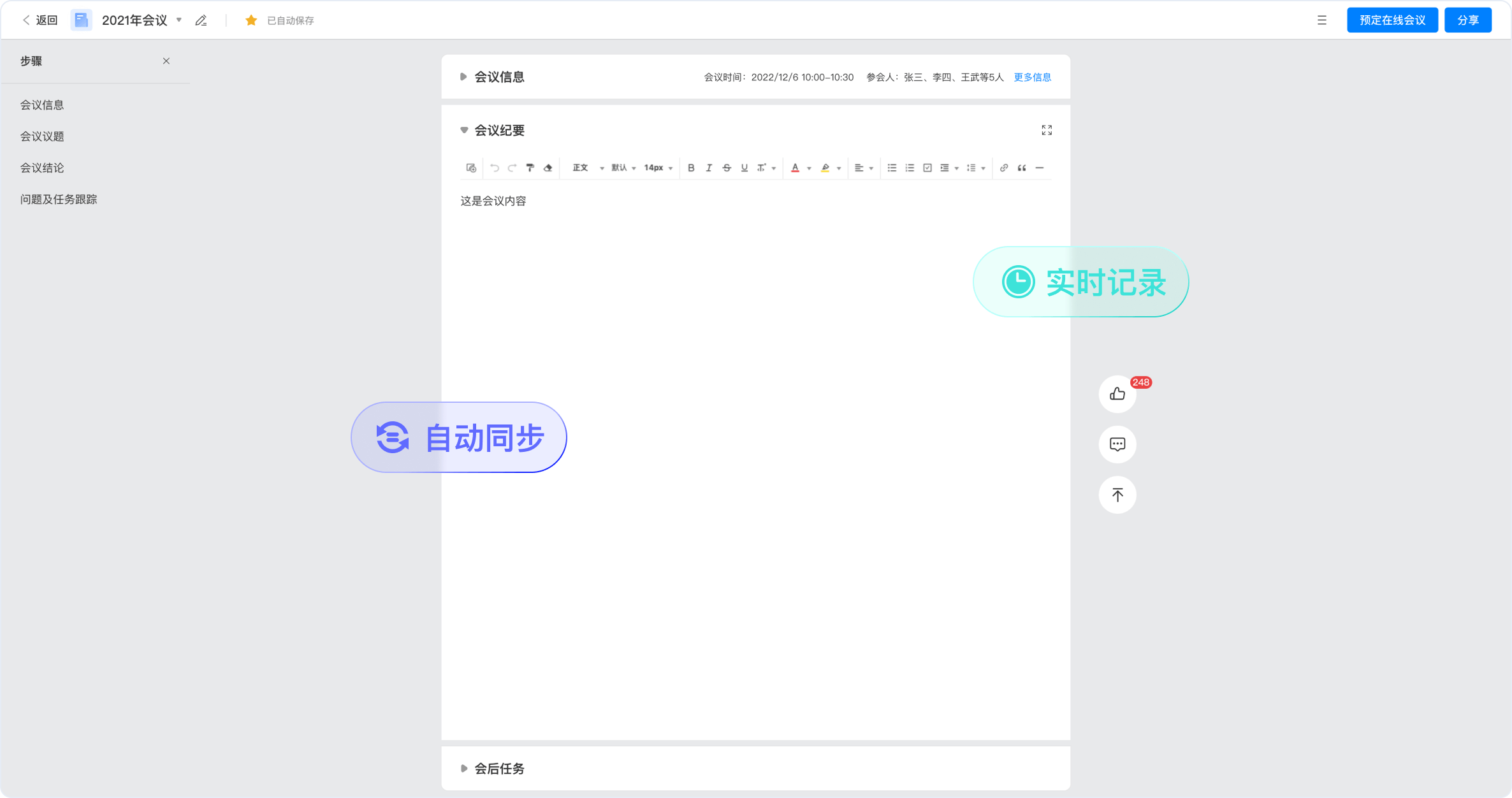 会中任务当场记录,自动同步待办任务,做到任务会后有通知-有跟进-过程透明-结果一目了然-责任到人。